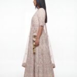 A dreamy floor-length Anarkali in soft blush georgette with all-over hand embroidery featuring pink floral and sage green leaf motifs, sequins, and mirror detailing. V-neckline with a fitted bodice and softly flared skirt. The sheer net dupatta carries a matching embroidered and sequined border. Comes with gold and blush kaleere. Professionally dry cleaned.